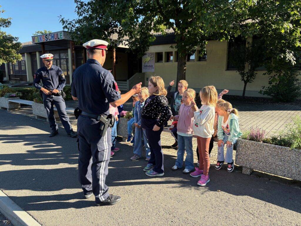 Die Polizei besuchte die VS St. Georgen im Rahmen der Verkehrs- und Mobilitätsbildung. Im Mittelpunkt stand das sichere Überqueren der Straße, ein wichtiges Thema für unsere neuen Schülerinnen und Schüler.Mit viel